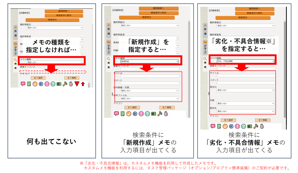 詳細検索では、検索対象となる「メモの種類」を指定できます(例えば「劣化・不具合情報メモ」等)。