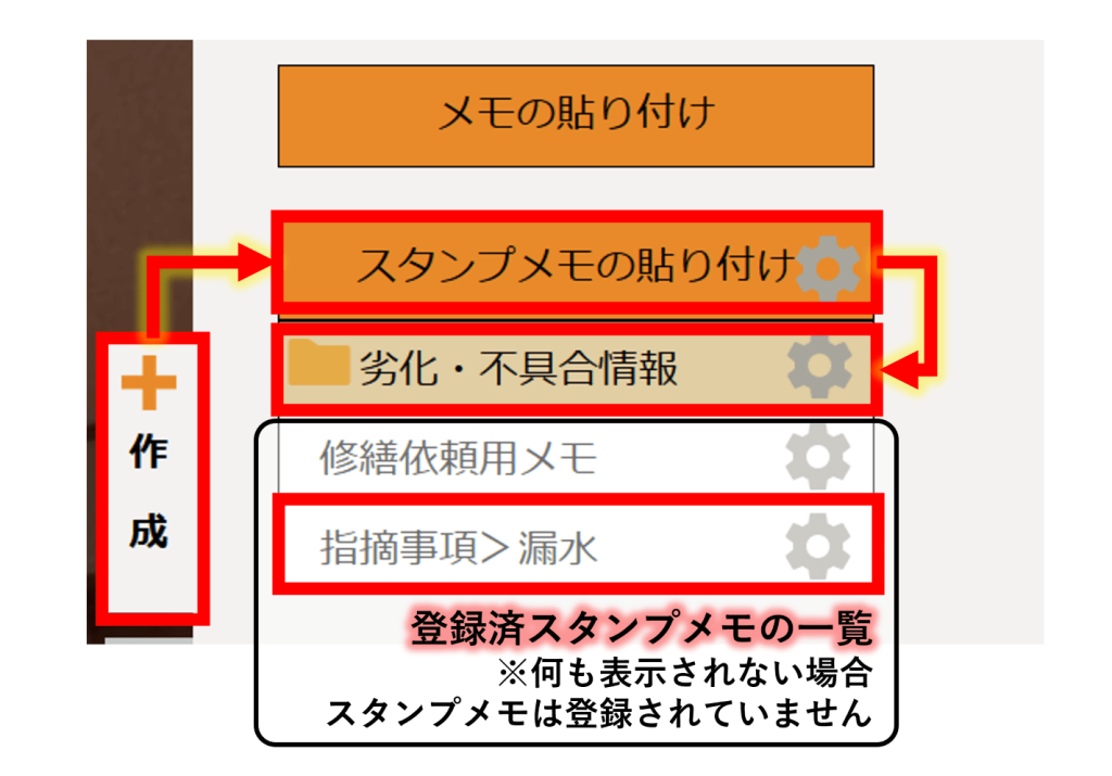 1.[+作成]タブ⇒[スタンプメモの貼り付け]⇒貼りたいスタンプメモが登録されている[フォルダ]⇒貼りたい[スタンプメモ]をクリック