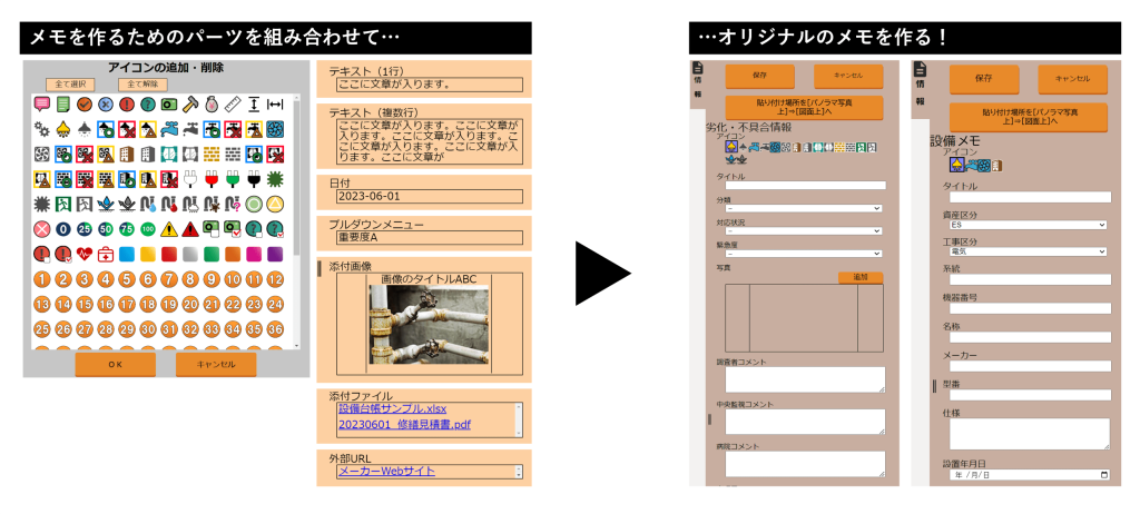 外部のURL(https://panomemo.comなど)を登録できる(「メーカー設備情報」、「他システム連携」等)。