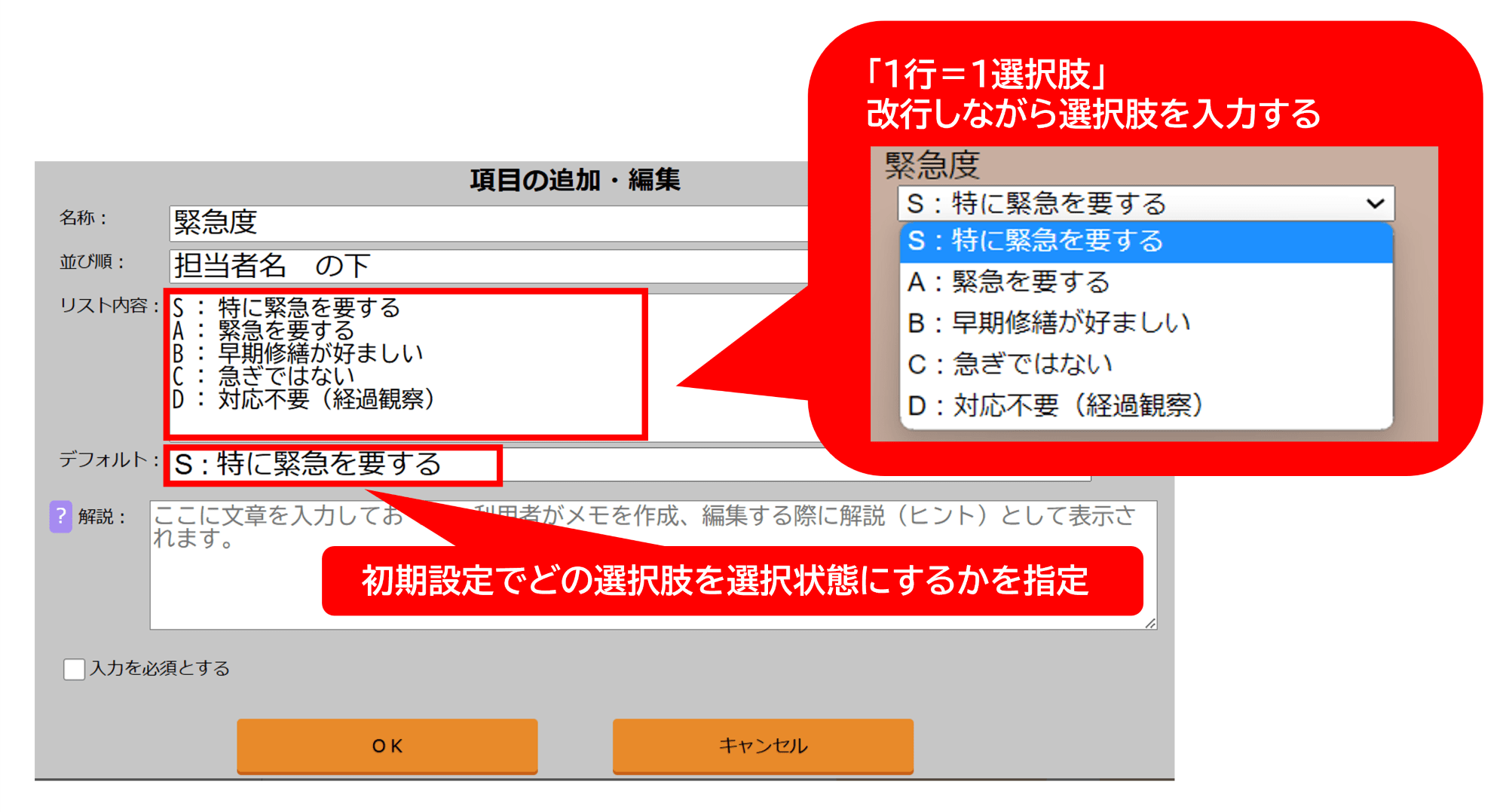 複数の選択肢から1つを選択するフォーム(「重要度」、「設備種別」等)。選択肢は自由に設定可能。