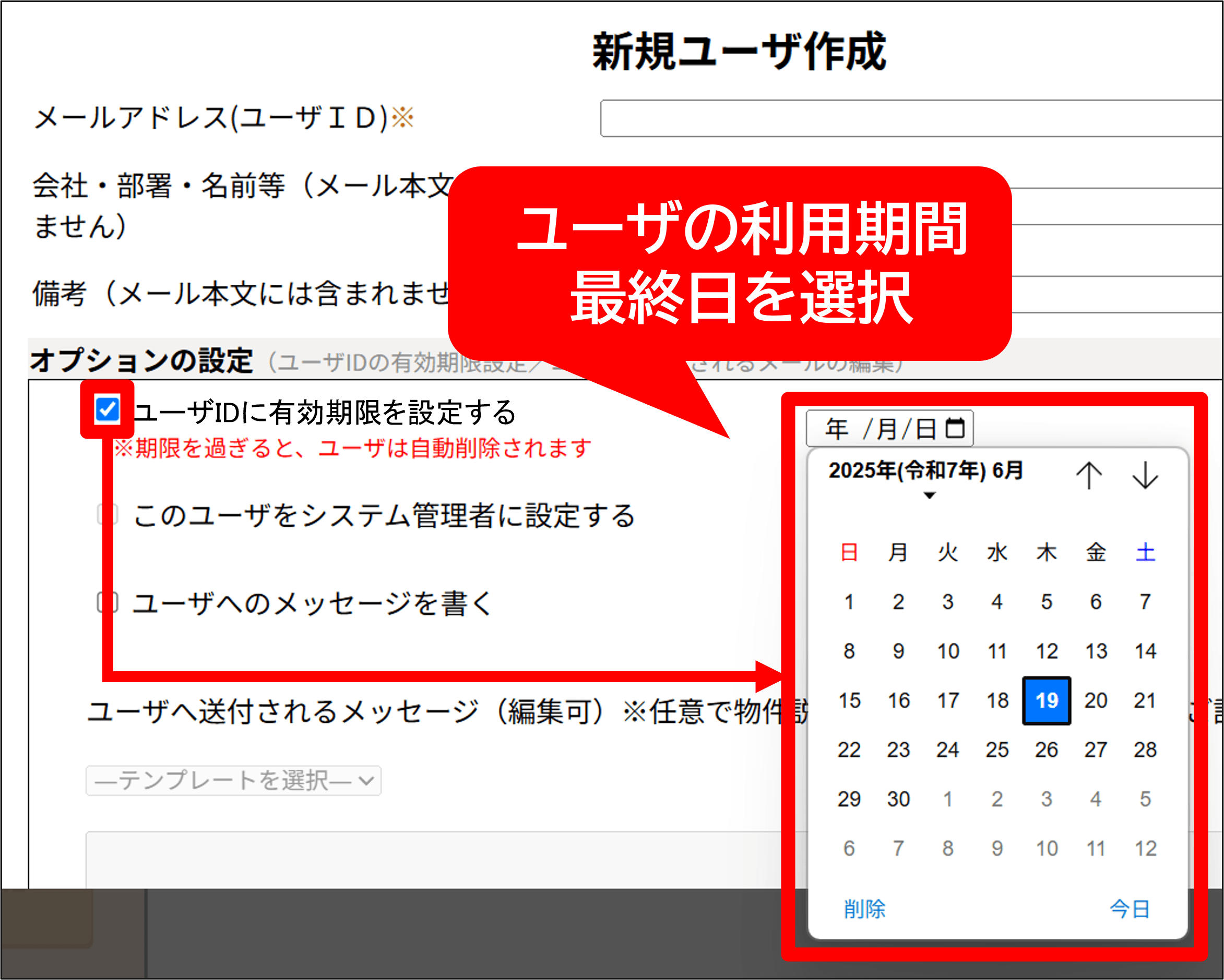 「ユーザIDに有効期限を設定する」にチェックを入れ、カレンダーから[利用期間最終日]を選択する。