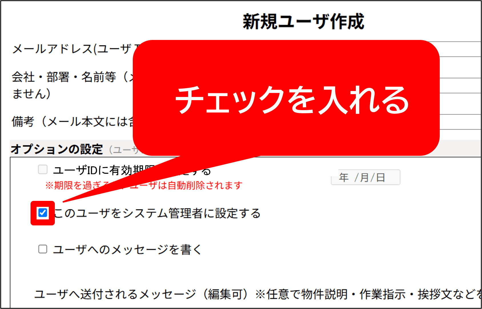 「ユーザへのメッセージを書く」にチェックを入れて、下の枠内にメッセージを入力する。