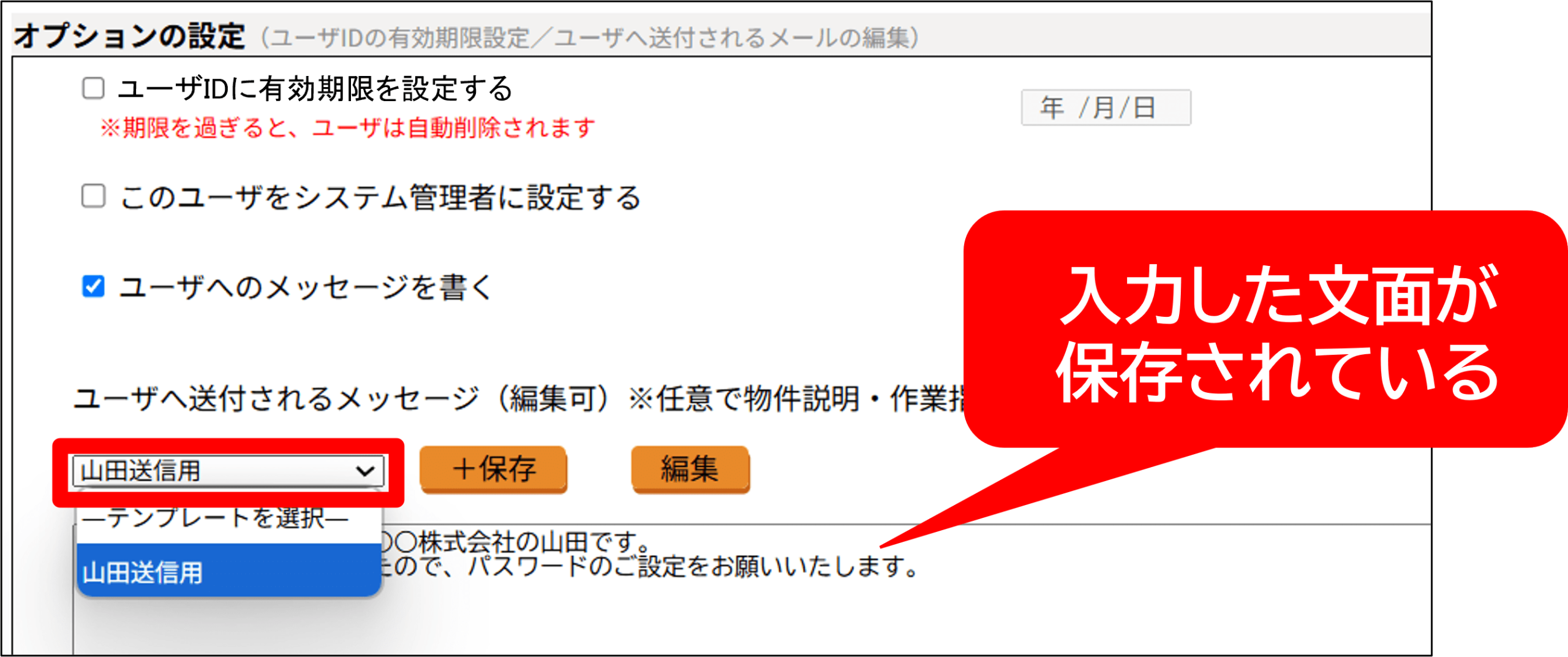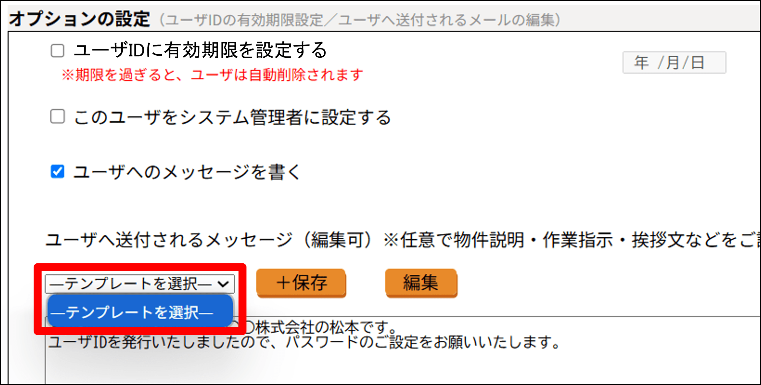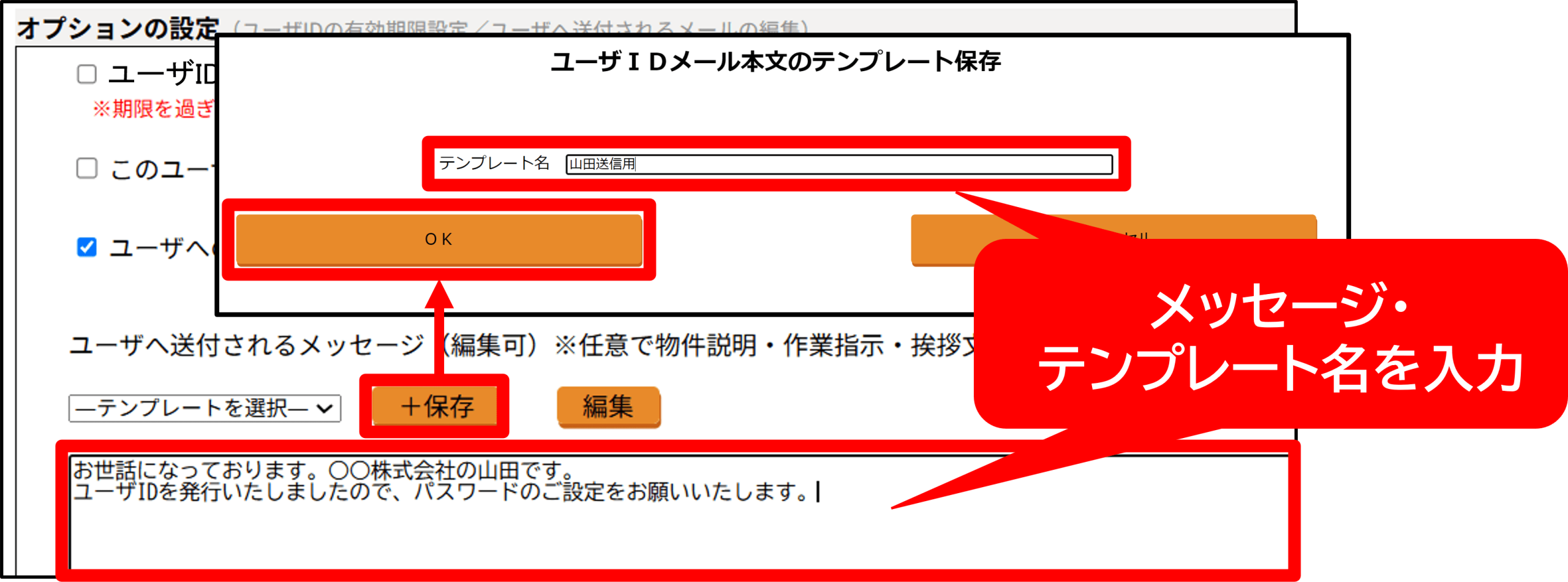 ● 新規ユーザへのメッセージをテンプレートとして保存するメッセージを入力して[保存]⇒「テンプレート名」に任意の名前を入力し、[OK]をクリック。