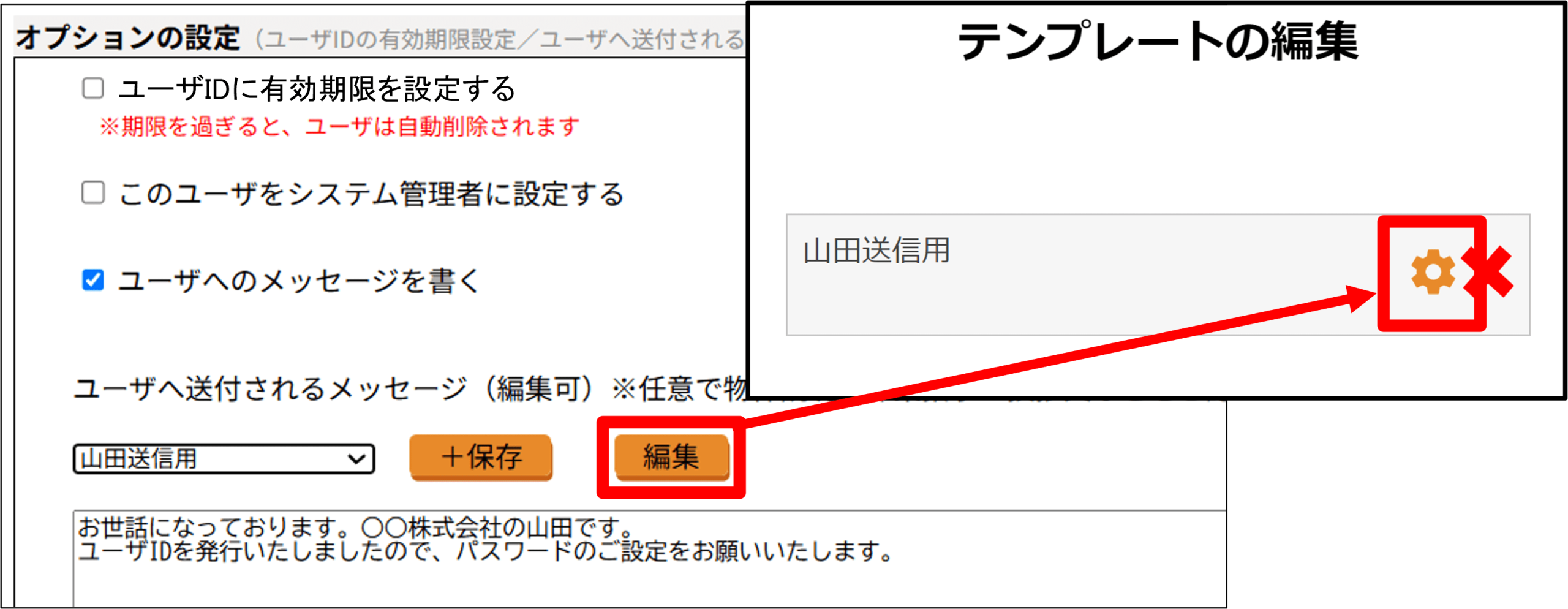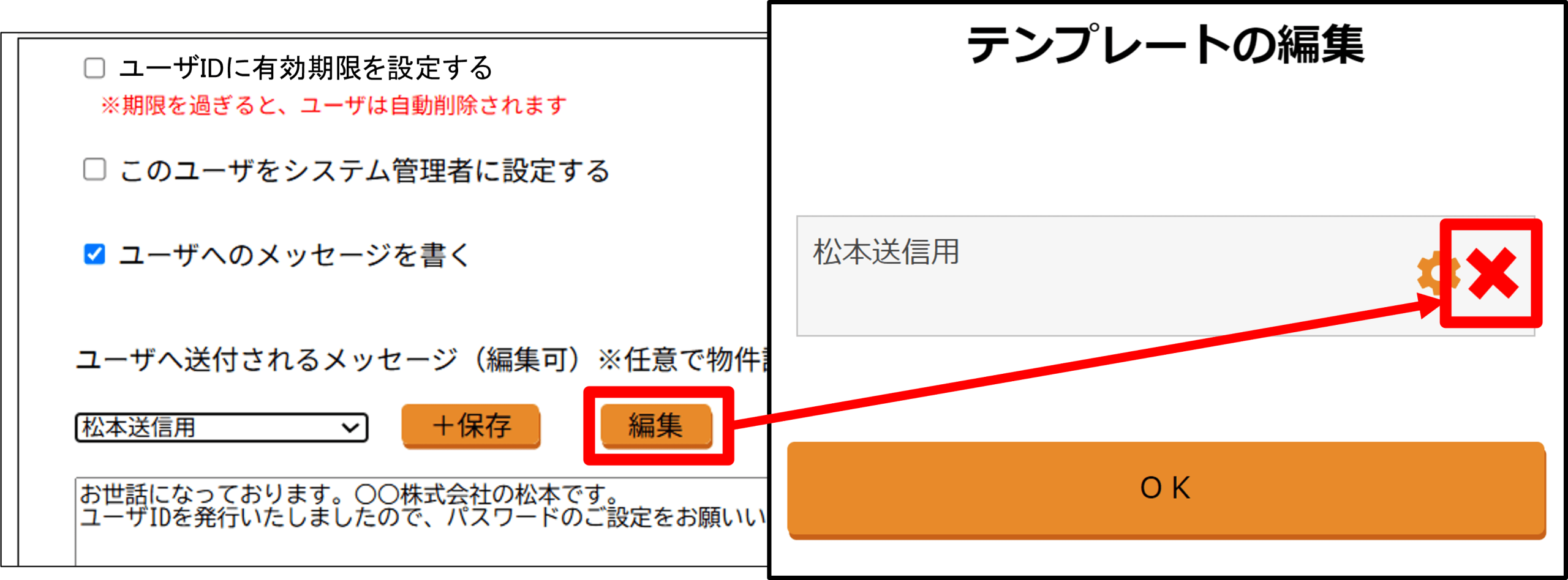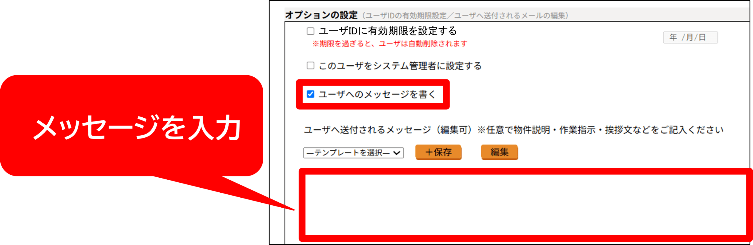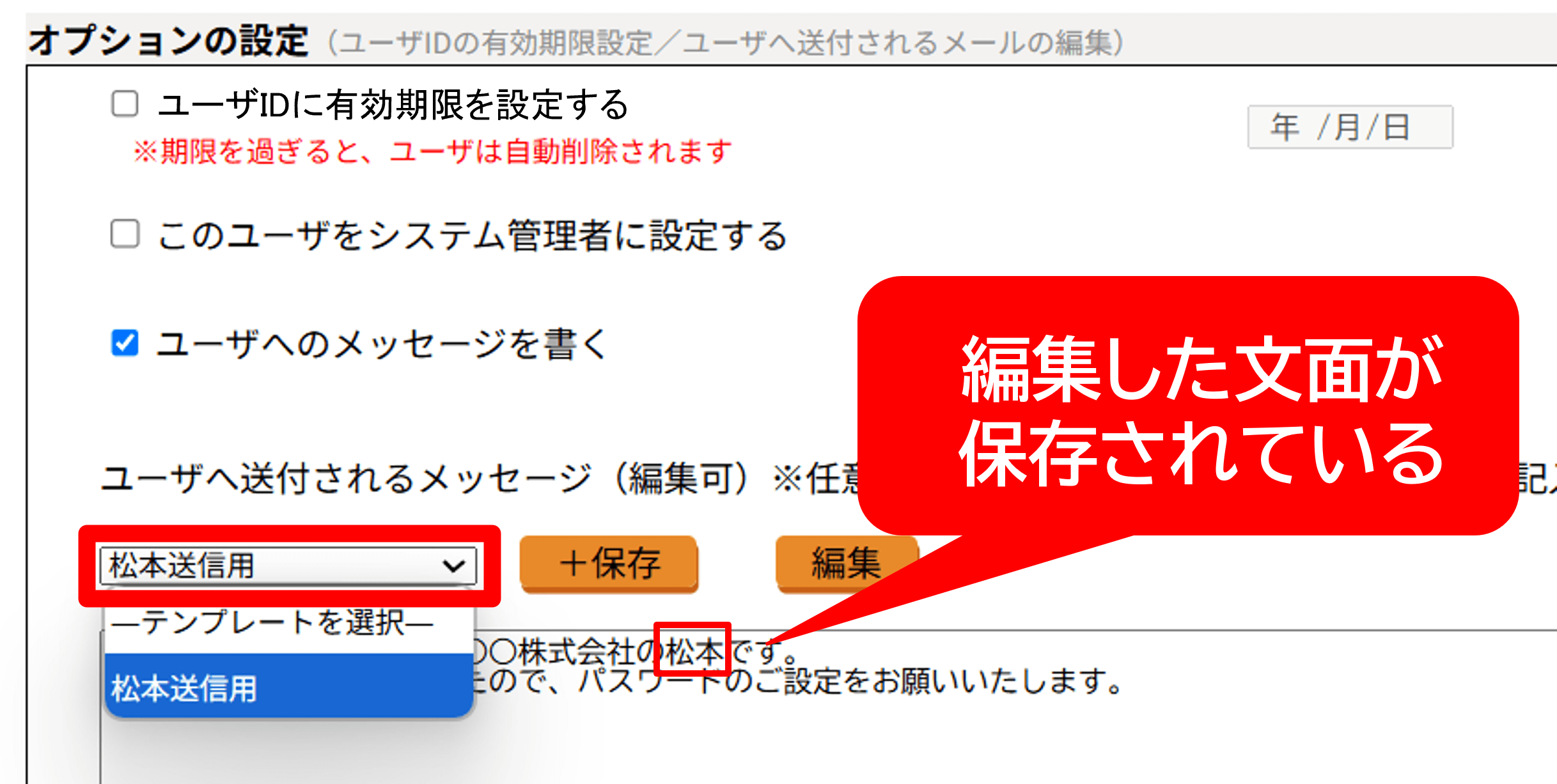 ● 新規ユーザへのメッセージをテンプレートとして保存するメッセージを入力して[保存]⇒「テンプレート名」に任意の名前を入力し、[OK]をクリック。