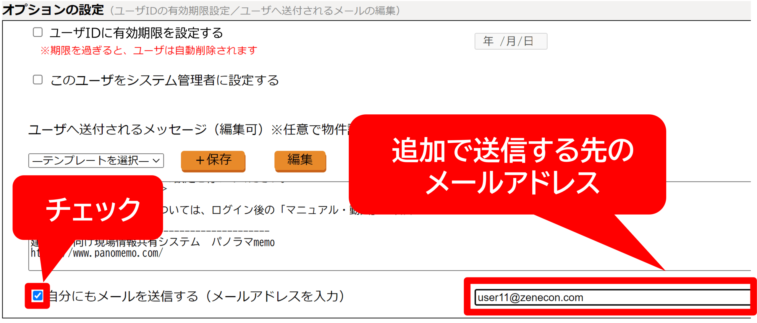 ● 新規ユーザ宛のメールを自分にも送信する「自分にもメールを送信する」にチェック⇒右枠に追加で送信したいメールアドレスを入力する。