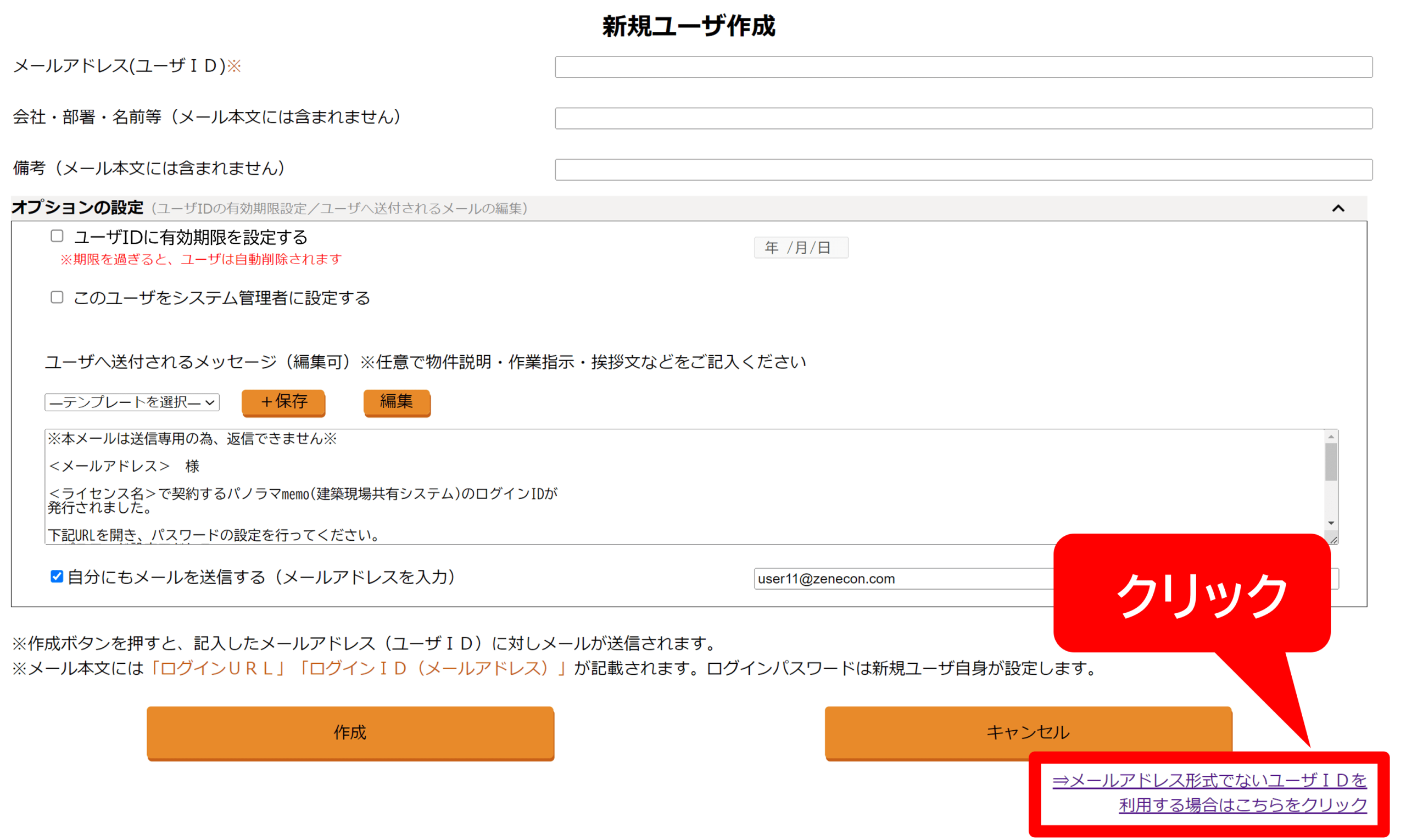 ● 「メールアドレス形式でないユーザIDを利用する場合」の設定方法「新規ユーザ作成」画面右下の[⇒メールアドレス形式でないユーザIDを利用する場合はこちらをクリック]をクリック。