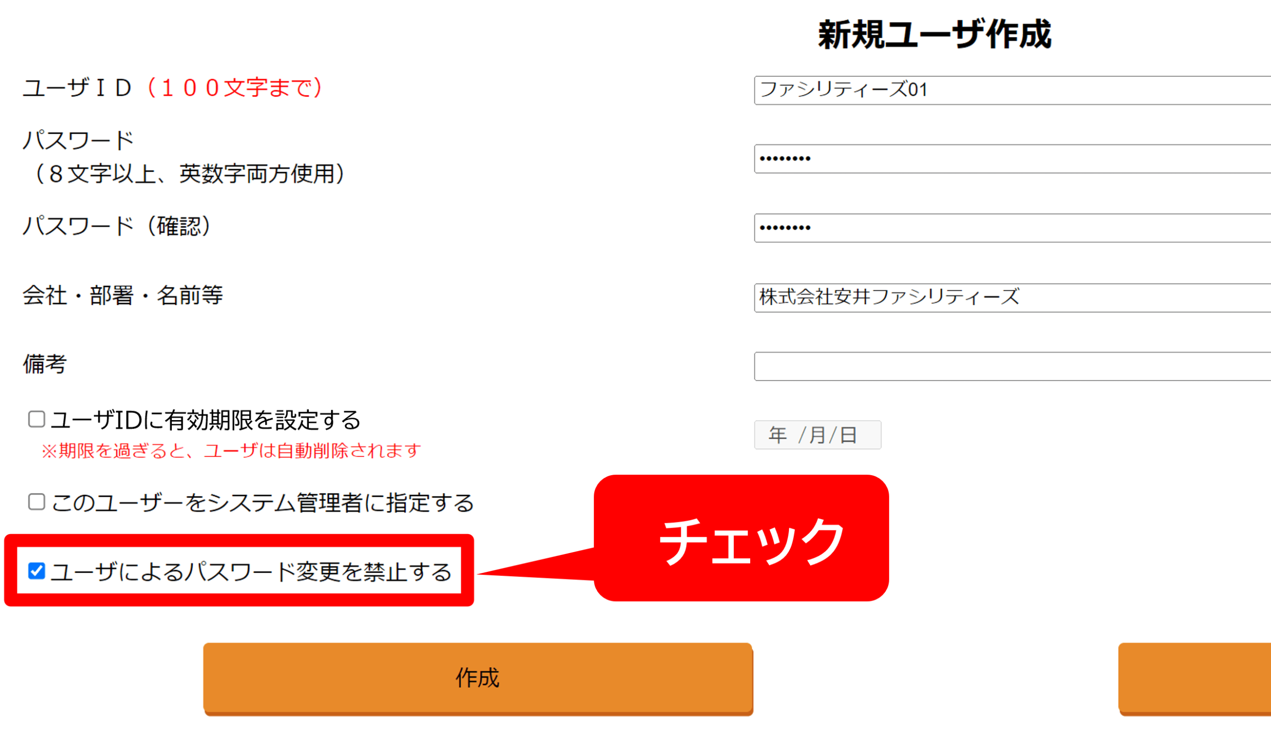 ※複数人でユーザIDを共有する場合等にご利用ください「ユーザによるパスワード変更を禁止する」にチェックを入れる。