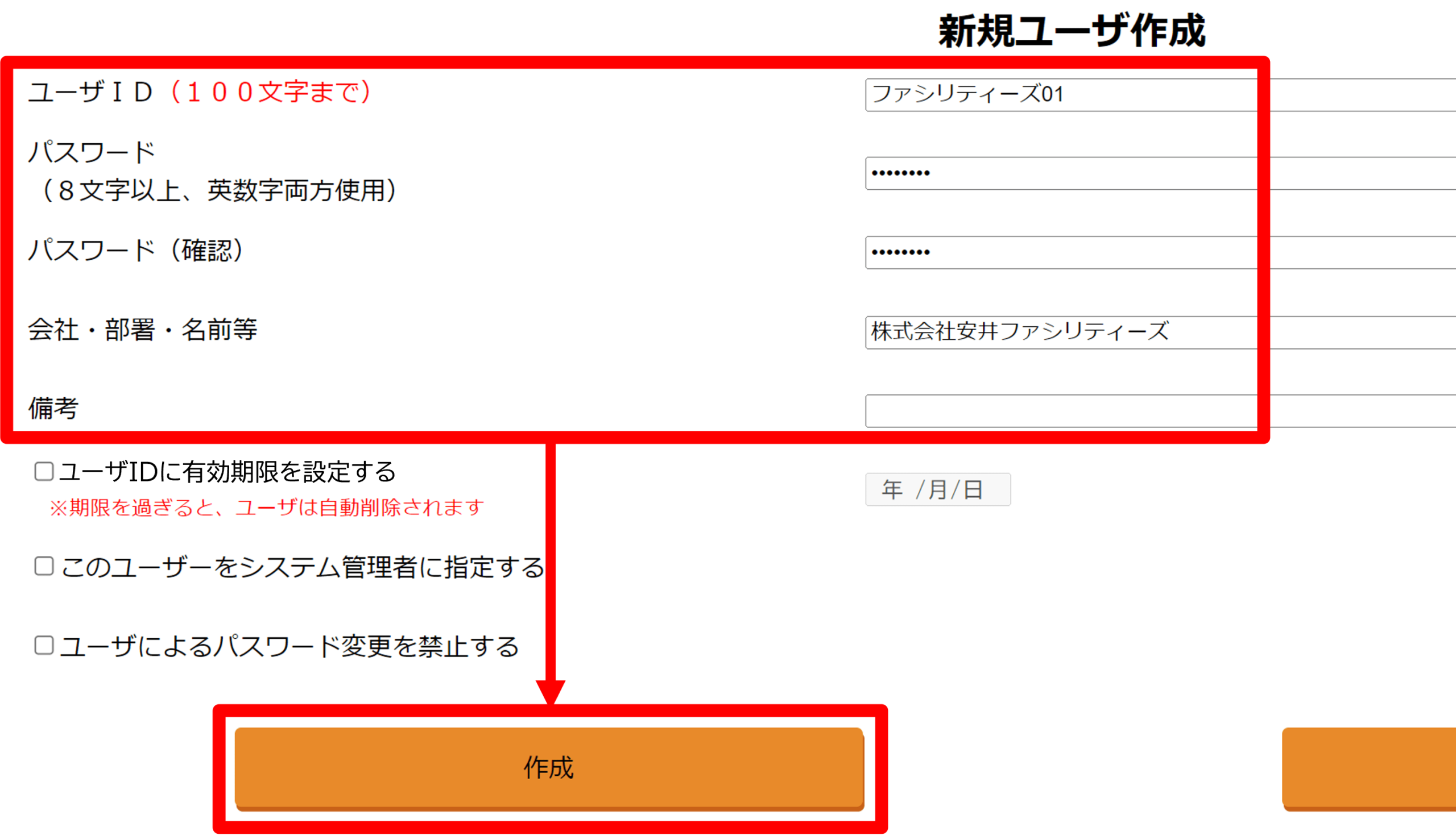 1-2.[新規ユーザ作成]⇒ 以下のユーザ情報を入力し、[作成]をクリック
