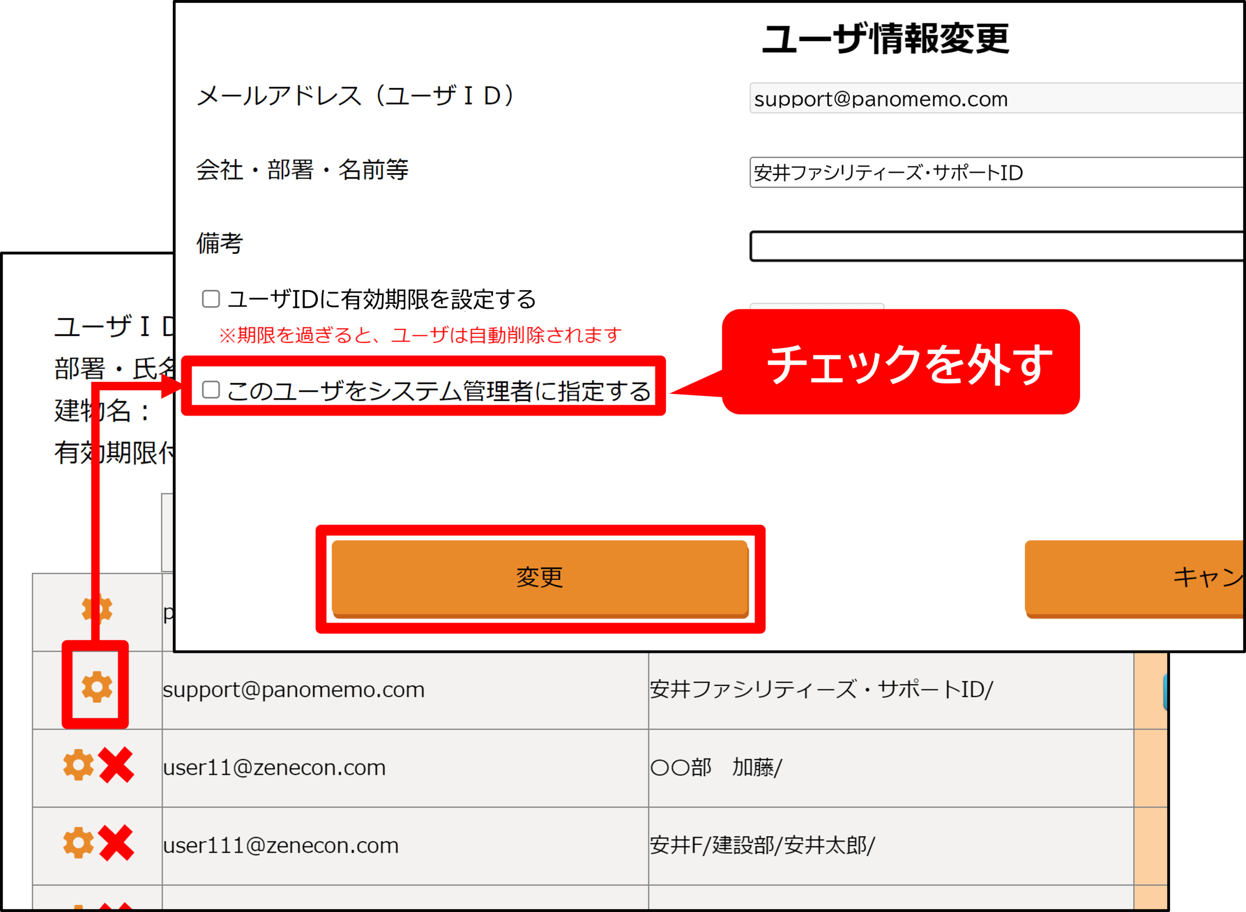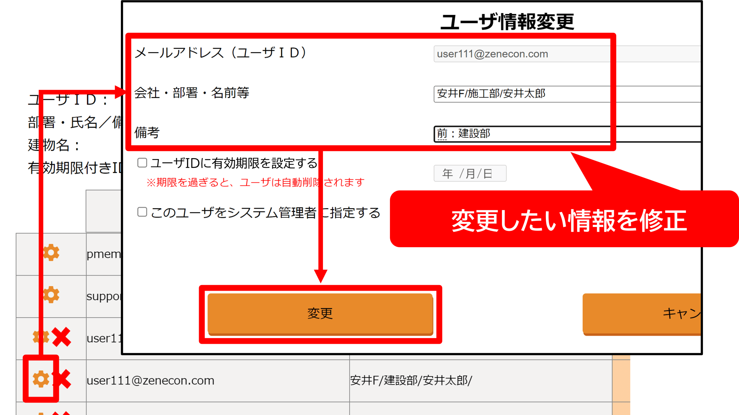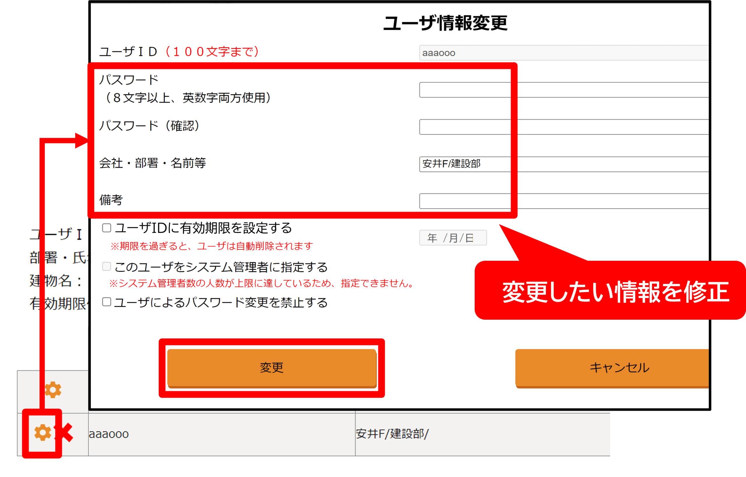 2-2.情報を変更したいユーザの[歯車]マーク⇒「会社・部署・名前等」、「備考」欄を修正し、[変更]をクリック